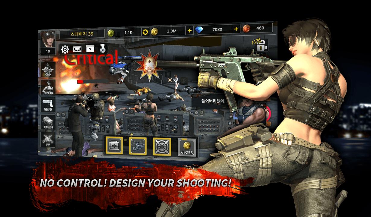 Users can raise skills with returning base, explore dungeons to gain combat parts, and level up through combat with enemy and zombies.